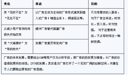 IPTV在短期內(nèi)的屬性還著重于電視媒體,在收入上偏向于后向媒體模式,通過用戶的流量來帶動后向廣告價值。借助IPTV的互動特性和頻道資源的豐富性,以空間來換取稀缺的時間資源。