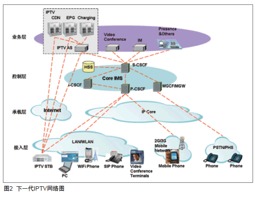 基于網(wǎng)絡(luò)視訊框架的下一代IPTV架構(gòu)堅(jiān)持業(yè)務(wù)與網(wǎng)絡(luò)、信令與媒體相分離的設(shè)計(jì)思想,以IMS為交換核心網(wǎng),以APP應(yīng)用服務(wù)器為業(yè)務(wù)引擎,以CDN為媒體分發(fā)網(wǎng)絡(luò),兼容移動(dòng)網(wǎng)絡(luò)、寬帶網(wǎng)絡(luò)和IMS/NGN網(wǎng)絡(luò),支持IPTV機(jī)頂盒、PC、智能終端,乃至3G終端(包含CS、PS域)等多樣化的類型終端,從而提供網(wǎng)絡(luò)電視、視頻點(diǎn)播、信息服務(wù)、PVR、TSTV、游戲、視頻通信等內(nèi)容豐富且無所不在的IPTV業(yè)務(wù)。