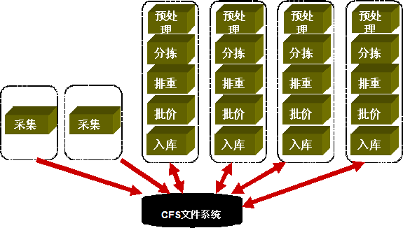 上圖即為江蘇聯(lián)通在新一代BSS計費系統(tǒng)的架構(gòu)描述:6臺計費應(yīng)用主機共享CFS文件系統(tǒng),兩臺應(yīng)用服務(wù)器負(fù)責(zé)從交換機采集話單文件,另外4臺應(yīng)用服務(wù)器則負(fù)責(zé)對采集后的話單進行預(yù)處理、分揀、排重、批價、入庫等過程。