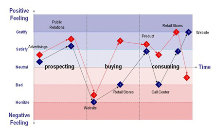 看一看“情感曲線”也許你就會(huì)頓悟。此處所示的兩條曲線來自兩個(gè)國際銀行。請(qǐng)注意曲線的不同之處。紅線所示的銀行與藍(lán)線所示的銀行相比在呼叫中心服務(wù)和店內(nèi)體驗(yàn)上都要略勝一籌。而藍(lán)線所示銀行在網(wǎng)上銀行這一項(xiàng)上表現(xiàn)更好!凹t線”銀行的競(jìng)爭資本是其卓越的客戶互動(dòng)體驗(yàn),無論是分行的面對(duì)面互動(dòng)還是來自聯(lián)絡(luò)中心的遠(yuǎn)程體驗(yàn)都屬一流。