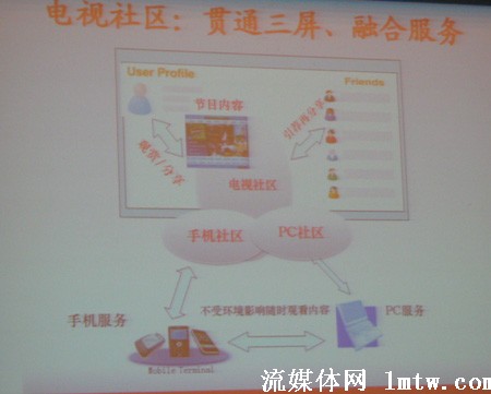 “百視通是廣電內(nèi)容出身,我們的核心競爭優(yōu)勢,就是要以優(yōu)秀的視頻內(nèi)容作為核心,把電視變得無所不在,拓展到三個屏上”李川說,電視本身只是一個屏,IP電視利用了互聯(lián)網(wǎng)技術,互動性已經(jīng)比傳統(tǒng)電視增加很多,但是其互動還是不會達到互聯(lián)網(wǎng)的程度。而三屏融合之后則不同,可以把“很多在互聯(lián)網(wǎng)上殺手級的應用搬到電視機上去”,他說百視通看好的是電視社區(qū)。因為,互聯(lián)網(wǎng)社區(qū)要素是參與和分享兩個層面,有了這兩個層面,電視就可以互動起來。