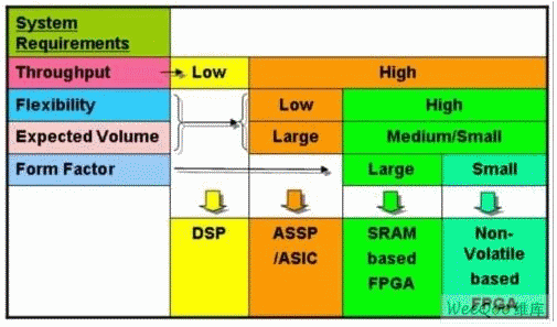 但是ASIC和ASSP帶來了高昂的非重復(fù)性工程費用成本,除非批量非常大。如果只有一小部分用戶使用特殊的功能模塊,那么FPGA解決方案可提供更好的回報。對于ASIC和ASSP,這些器件有限的功能和固有的不靈活性,不允許在設(shè)計完成后根據(jù)市場的要求改進(jìn)或添加新的功能。FPGA卻能提供廣泛的功能和高度的靈活性。