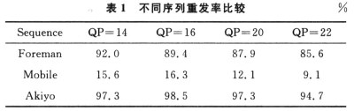 為了更全面評(píng)價(jià)本算法的性能,對(duì)不同測(cè)試序列在同樣丟包率情況下對(duì)本章的機(jī)制進(jìn)行性能測(cè)試?紤]到影響本章算法性能的包括序列的紋理復(fù)雜程度以及運(yùn)動(dòng)劇烈程度。這里利用運(yùn)動(dòng)較為劇烈但紋理相對(duì)較單一的Foreman序列,紋理復(fù)雜程度較高的Mobile以及運(yùn)動(dòng)程度較低的Akiyo序列作為評(píng)測(cè)序列。表1是對(duì)這三個(gè)測(cè)試序列在QP=14,16,20,22,丟包率為3%的情況下前100幀做的統(tǒng)計(jì),其中出錯(cuò)Slice個(gè)數(shù)為24,則出錯(cuò)宏塊總數(shù)為24×11=264。令NMB=264,則根據(jù)模式判決結(jié)果,即可得到對(duì)重發(fā)率的統(tǒng)計(jì)。
