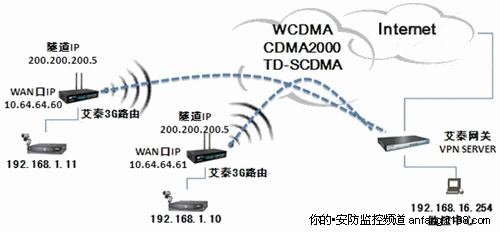 此組網(wǎng)方案是在艾泰3G路由器連接到公網(wǎng)監(jiān)控中心的基礎(chǔ)上建立VPN隧道方式來(lái)傳輸視頻圖像,組網(wǎng)實(shí)施如下: