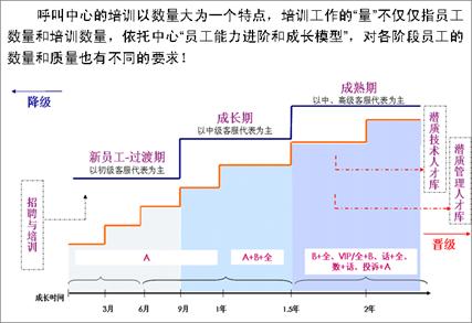 業(yè)務(wù)模塊化后,客服中心對一線客服代表進行分級認(rèn)證,針對簡單業(yè)務(wù)和復(fù)雜業(yè)務(wù)分別設(shè)置首層和二線專席兩類共計8種人員承接梯隊,達到業(yè)務(wù)與人員的全匹配。人員梯隊的設(shè)置對人員的培訓(xùn)管理和進出機制提出了新的挑戰(zhàn),如何科學(xué)界定不同隊列人員的技能標(biāo)準(zhǔn)?如何設(shè)置不同成長時期員工的進出管理機制?