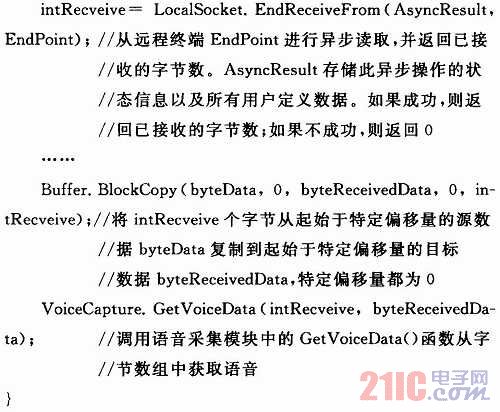 具體流程如圖4所示。從網(wǎng)絡(luò)上獲取的數(shù)據(jù)實(shí)際是由Local Socket.Begin Receive From()函數(shù)提取網(wǎng)絡(luò)數(shù)據(jù),再經(jīng)接收數(shù)據(jù)函數(shù)轉(zhuǎn)移給Get Voice Data()函數(shù),Get Voice Data()函數(shù)提取后放入語音緩沖區(qū)供音頻編解碼器提取并播放。Get Voice Data()函數(shù)首先用支持存儲(chǔ)區(qū)為內(nèi)存的流Memory Stream從緩沖區(qū)讀取數(shù)據(jù)byte Receive,將字節(jié)塊寫入當(dāng)前流: