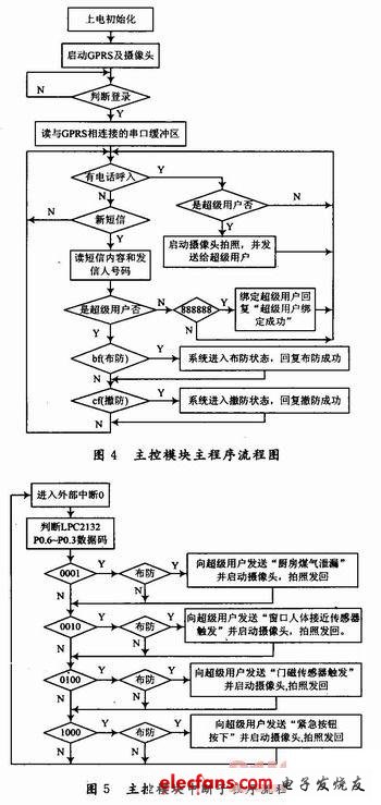 在主控模塊主程序中系統(tǒng)一直在檢測是否有來電和新短信信息,當(dāng)有來電時系統(tǒng)會自動掛斷電話,然后判斷是不是超級用戶:是,啟動攝像頭拍照,并發(fā)送給超級用戶;不是,系統(tǒng)將不理睬,繼續(xù)檢測。當(dāng)是短消息時,判斷是否是超級用戶:不是,判斷短信內(nèi)容是“888888 ”否,是則系統(tǒng)綁定該號碼為超級用戶,并回復(fù)“超級用戶綁定成功”;是,判斷短信內(nèi)容是否是“bf”或“cf”,是“bf”系統(tǒng)進(jìn)入布防狀態(tài),并回復(fù)“布防成功”,是“cf”系統(tǒng)撤防,回復(fù)“撤防成功”。