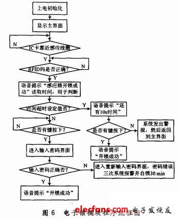 如圖2所示,電子鎖原始密碼和用戶設(shè)定密碼已存于外部存儲器E2PROM內(nèi),用戶要開門需先用電子感應(yīng)鑰匙開RFID碼感應(yīng)鎖,當(dāng)感應(yīng)鎖成功開鎖時,系統(tǒng)將發(fā)出語音提示“感應(yīng)鎖開鎖成功”,然后輸入先前設(shè)定的密碼,密碼正確后,系統(tǒng)發(fā)出語音提示“開鎖成功”,否則提示“輸入密碼錯誤”。輸入密碼三次以上錯誤,系統(tǒng)將報警并自鎖30 min。整個開鎖時間不能超過30 s,否則系統(tǒng)發(fā)出警報聲,以防止盜賊在短時間內(nèi)利用萬能工具開鎖。系統(tǒng)待機(jī)時能在液晶上顯示時間、日期和星期等信息,實現(xiàn)友好的人機(jī)界面。