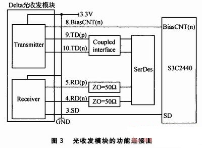 光收發(fā)模塊的功能連接圖如圖3所示。其中3.SD是光收發(fā)模塊的第3個引腳,它的功能可以描述為有光輸入時為邏輯高,否則為邏輯低;4.RD(n)是第4個引腳,反向接收數(shù)據(jù)的輸出;5.RD(p)是第5個引腳,正向接收數(shù)據(jù)的輸出;8.BiasCNT(n)是第8個引腳,控制ONU突發(fā)模式操作的負(fù)脈沖;9.TD(p)是第9個引腳,正向發(fā)送數(shù)據(jù)的輸入;10.TD(n)是第10個引腳,反向發(fā)送數(shù)據(jù)的輸入。