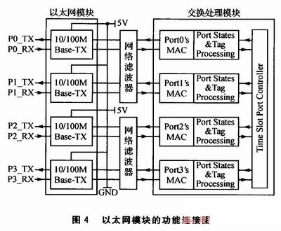 以太網(wǎng)模塊的功能連接圖如圖4所示,進出以太網(wǎng)接口的信號都需要經(jīng)過網(wǎng)絡(luò)濾波器,網(wǎng)絡(luò)濾波器實質(zhì)上是一個選頻電路,它的功能就是允許某一部分頻率的信號順利的通過,而另外一部分頻率的信號則受到較大的抑制。與網(wǎng)絡(luò)濾波器相連的是交換處理模塊中的Port's MAC(M-edia Access Controllers),用來解決在共用信道中產(chǎn)生競爭時分配信道的使用權(quán)問題。