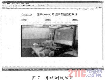 在集成開發(fā)環(huán)境CCS(C6000)下,加載相關(guān)驅(qū)動(dòng)程序,對(duì)本系統(tǒng)進(jìn)行了測(cè)試。CCD攝像頭為標(biāo)準(zhǔn)PAL制式,圖像采集的幀頻為25幀/s,圖像的分辨率為720×576像素。測(cè)試結(jié)果如圖7所示。測(cè)試結(jié)果表明,網(wǎng)絡(luò)連接正常,用戶在PC端可通過瀏覽器訪問系統(tǒng),成功實(shí)現(xiàn)遠(yuǎn)程監(jiān)控。