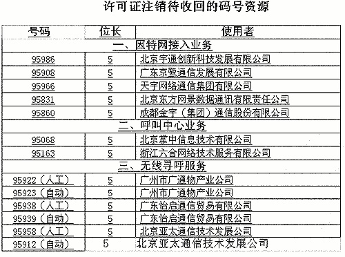 信產部公告稱,對這次經營許可證注銷涉及的13個號碼,將依據(jù)《電信網碼號資源管理辦法》(信息產業(yè)部令第28號)將予以收回。(高飛)