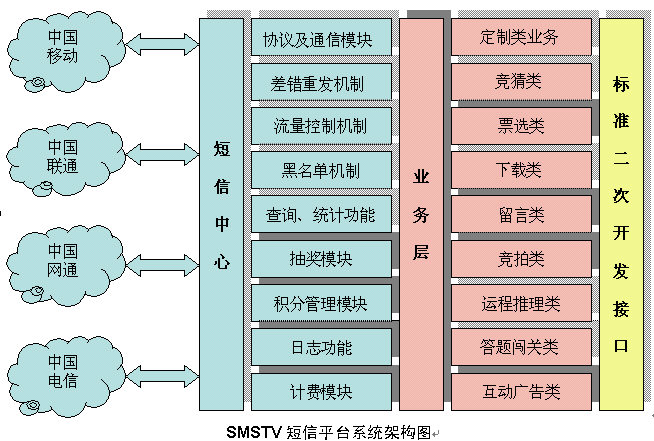 SMSTV短信增值平臺(tái)產(chǎn)品由通信層(短信中心)、業(yè)務(wù)層(業(yè)務(wù)平臺(tái))和接口層(標(biāo)準(zhǔn)二次開發(fā)接口)三層組成(參見2.2.2系統(tǒng)架構(gòu)圖),三層之間通過專有網(wǎng)絡(luò)協(xié)議互聯(lián),實(shí)現(xiàn)高速數(shù)據(jù)通信。
