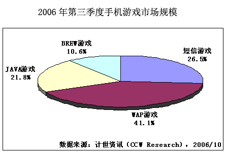 計(jì)世資訊(CCW Research)數(shù)據(jù)顯示,2006年第三季度中國手機(jī)游戲市場規(guī)模達(dá)到6.7億元人民幣,比第二季度增長11.9%。 手機(jī)游戲市場規(guī)模包括移動(dòng)運(yùn)營商、手機(jī)游戲服務(wù)提供商在手機(jī)游戲業(yè)務(wù)上的總體收入,但不包括手機(jī)游戲軟件開發(fā)商的收入。第三季度,短信游戲增速繼續(xù)放緩,短信游戲市場規(guī)模達(dá)到1.8億元,占手機(jī)游戲市場份額的26.5%。WAP,JAVA和BREW游戲繼續(xù)保持快速增長,第三季度WAP、JAVA和BREW游戲市場規(guī)模分別為2.8億元、1.4億元和0.7億元。