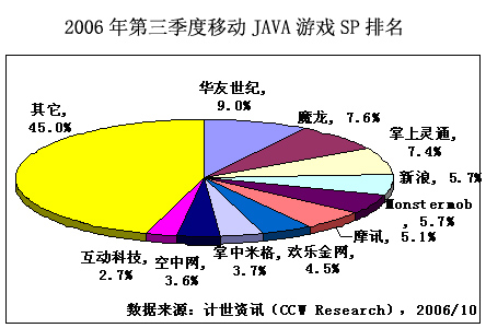 受到中國移動(dòng)對SP自消費(fèi)行為的打擊和新政影響,第三季度中國移動(dòng)JAVA業(yè)務(wù)分賬前信息費(fèi)為1.1億元,華友世紀(jì)優(yōu)勢明顯,占市場份額的9.0%,排名二到五位的SP分別為魔龍、掌上靈通、新浪和Monstermob,他們的市場份額分別為7.6%、7.4%、5.7%和5.7%。前十位廠商合計(jì)占到55.4%的市場份額。