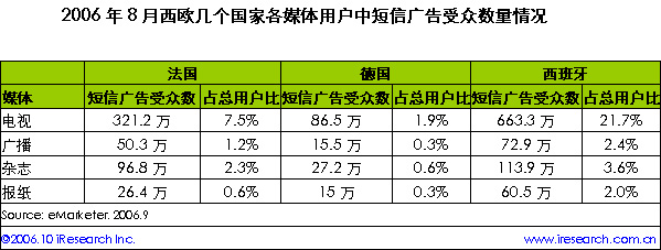 iResearch艾瑞市場咨詢根據(jù)eMarketer資料整理顯示,短信廣告在西歐國家大行其道,成百上千萬的移動用戶訂閱了廣告短信。西歐各國不同媒體訂閱廣告短信的用戶數(shù)不盡相同。總體上來看,西班牙的短信廣告受眾最多,電視用戶中有21.7%人訂閱了短信廣告,數(shù)量達663.3萬。相比之下,法國電視用戶中的短信廣告受眾只有西班牙的1/2,德國則更少。