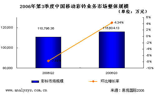 研究表明,2006年第3季度,CRBT業(yè)務(wù)略有反彈。其中移動(dòng)彩鈴業(yè)務(wù)的分帳前信息費(fèi)接近16000萬元,較上個(gè)季度小幅度反彈2.6%。但是總體上仍然呈現(xiàn)徘徊態(tài)勢(shì),并沒有走出低級(jí)飽和區(qū)。
