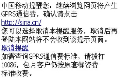 從2007年5月17日起,通過(guò)手機(jī)訪問(wèn)WAP網(wǎng)站,中國(guó)移動(dòng)向用戶(hù)主動(dòng)提供一個(gè)收費(fèi)提示頁(yè)面,提醒用戶(hù)“正在使用手機(jī)上網(wǎng)業(yè)務(wù),若繼續(xù)瀏覽網(wǎng)頁(yè),將會(huì)產(chǎn)生GPRS通信費(fèi)”。但打開(kāi)中國(guó)移動(dòng)夢(mèng)網(wǎng)頁(yè)面,則不會(huì)有上述提示。