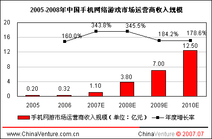 創(chuàng)業(yè)投資研究機(jī)構(gòu)ChinaVenture近日發(fā)布了《ChinaVenture 2007年中國手機(jī)網(wǎng)游行業(yè)投資價(jià)值研究報(bào)告》,該報(bào)告顯示,2007年隨著手機(jī)網(wǎng)游用戶數(shù)量和產(chǎn)品大規(guī)模增加,手機(jī)網(wǎng)游市場運(yùn)營收入將達(dá)1.10億人民幣。2008年仍將呈現(xiàn)高速增長,達(dá)3.80億元人民幣。(見圖一)
