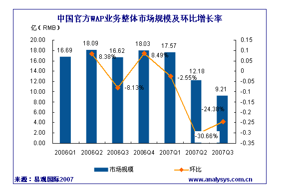 易觀(guān)國(guó)際研究表明,2007年第3季度中國(guó)官方WAP市場(chǎng)規(guī)模達(dá)到9.21億人民幣,同比下降44.57%。中國(guó)移動(dòng)WAP頁(yè)面“資費(fèi)提醒”政策對(duì)市場(chǎng)的影響已得到控制,與2季度WAP市場(chǎng)規(guī)模逐月遞減現(xiàn)象相比,2007年7月、8月、9月WAP市場(chǎng)規(guī)模呈現(xiàn)穩(wěn)步增長(zhǎng)趨勢(shì)。中國(guó)聯(lián)通WAP市場(chǎng)規(guī)模為1.065億元,同比下降47.55%,自中國(guó)聯(lián)通四月份改實(shí)收結(jié)算后,信息費(fèi)一直呈現(xiàn)下降趨勢(shì)。