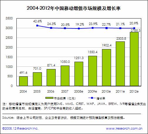 根據(jù)iResearch艾瑞咨詢即將推出的《2008-2009年中國移動互聯(lián)網(wǎng)行業(yè)發(fā)展報告》統(tǒng)計,2008年中國移動增值市場規(guī)模達(dá)1251.3億人民幣(約合183.2億美元),相比2007年的1050億人民幣年同比僅增長19.2%,相比2007年增速放緩。(中國移動增值市場規(guī)模定義為用戶為各項移動增值業(yè)務(wù)付費總和)