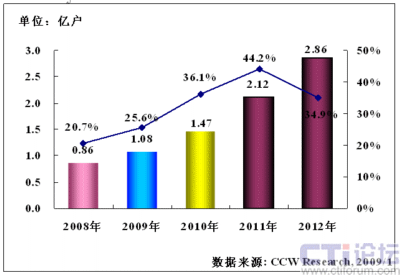 計(jì)世資訊(CCW Research)研究預(yù)測(cè),2009年中國(guó)移動(dòng)支付用戶數(shù)將達(dá)到1.08億戶,其同比增長(zhǎng)率將達(dá)到25.6%,預(yù)計(jì)2010年中國(guó)移動(dòng)支付用戶數(shù)將達(dá)到1.47億戶,其同比增長(zhǎng)率將達(dá)到36.1%,2011年中國(guó)移動(dòng)支付用戶數(shù)將達(dá)到2.12億戶,其同比增長(zhǎng)率將達(dá)到44.2%,2012年中國(guó)移動(dòng)支付用戶數(shù)將達(dá)到2.86億戶,其同比增長(zhǎng)率將達(dá)到34.9%。