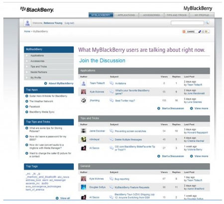 從某種程度而言,MyBlackBerry并不是一個(gè)真正的社交網(wǎng)站,而更像一個(gè)用戶留言板。網(wǎng)站具有一定的針對性,允許使用同型號(hào)設(shè)備的用戶進(jìn)行交流。例如,使用BlackBerry
