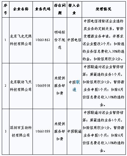 據(jù)悉,這3家增值電信企業(yè)是北京飛龍無限科技有限公司,存在明碼標(biāo)價(jià)不規(guī)范問題;北京聯(lián)動(dòng)飛天科技有限公司,未提供服務(wù)卻扣費(fèi);深圳市互動(dòng)科技有限公司,未提供服務(wù)卻扣費(fèi)。