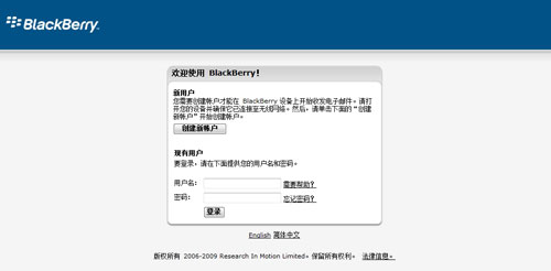 中電信黑莓網絡服務注冊頁面曝光