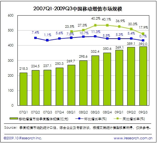 2009Q3中國移動增值市場規(guī)模達392.0億元,同比增長17.9%,環(huán)比增長0.7%。