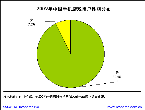 當(dāng)樂網(wǎng)調(diào)研數(shù)據(jù)顯示,2009年手機(jī)游戲用戶性別比例依然是男性居高。手機(jī)游戲用戶男性占比為92.8%,女性占比僅為7.2%。