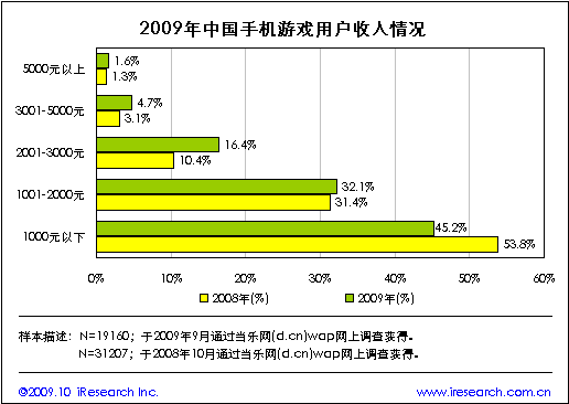 當(dāng)樂網(wǎng)調(diào)研數(shù)據(jù)顯示,2009年手機(jī)游戲用戶的月收入在1000~3000元之間的占比為48.5%,較2008年增長6.7個(gè)百分點(diǎn)。收入高于2000元的中高收入用戶群體占22.7%,比2008年占比上升7.9個(gè)百分點(diǎn),收入在1000元以下的低收入群體占45.2%,比2008年占比減少8.6個(gè)百分點(diǎn)。與2008年對(duì)比,2009年手機(jī)游戲用戶的收入水平有明顯提高,用戶的消費(fèi)潛力有所增強(qiáng)。