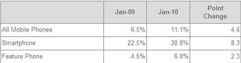 comScore的數(shù)據顯示,2010年一月,有11.1%的手機用戶通過手機瀏覽器訪問了社交網站,相比去年同期增加了4.6個百分點。在智能手機用戶中,這一比例達到了30.8%,同比增加了8.3個百分點。