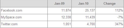 而具體到網站,用手機瀏覽器訪問Facebook、Myspace、Twitter的用戶分別達到了2510萬、1140萬和470萬。要知道,這還不包括接近600萬通過手機應用程序(即客戶端)訪問社交網絡的用戶。