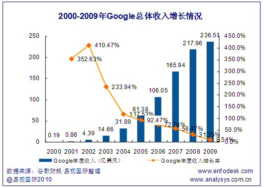 從谷歌的總體營收增長情況可以看出,谷歌雖然保持了相對平穩(wěn)的整體營收增長態(tài)勢,但是其增長速率已經(jīng)從2001、2002年超過300%的高速增長降低到2009年的8.54%。整體來看,谷歌的營收增長能力已經(jīng)大幅度降低,減緩收入下滑速度的業(yè)務發(fā)展壓力下,谷歌需要拓展新的市場以重新構(gòu)建業(yè)務的高速增長。