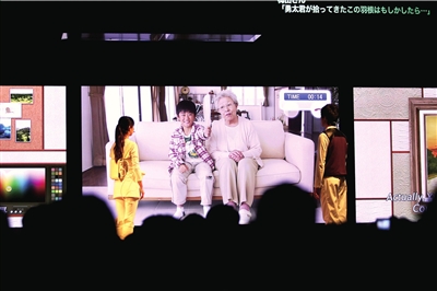 在日本館可打視頻電話的大屏幕前,主持人正在現(xiàn)場視頻對話遠在未來日本的朋友
