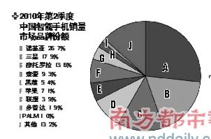 據(jù)統(tǒng)計(jì),今年二季度諾基亞智能手機(jī)約占整個(gè)中國市場的26.7%,創(chuàng)下近年來的歷史低點(diǎn)。上周,被業(yè)界視作Symbian和諾基亞“救世主”的旗艦機(jī)型N8正式在中國發(fā)布。然而,由于其采用的全新Symbian3平臺屬諾基亞舊主力平臺S60和新平臺Meego之間的過渡產(chǎn)品,對諾基亞本身來說就不是主力推廣平臺,第三方軟件支持亦寥寥無幾,市場前景堪憂。在智能手機(jī)戰(zhàn)場上,被指創(chuàng)新匱乏、競爭力趨弱的諾基亞正逐步失守。