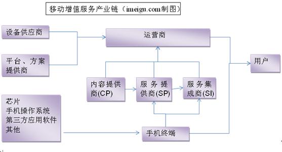 中國電信,中國移動(dòng),中國聯(lián)通是中國的三大電信運(yùn)營商。移動(dòng)增值服務(wù)和移動(dòng)支付解決方案已構(gòu)成了移動(dòng)運(yùn)營商的兩大收入來源。移動(dòng)增值業(yè)務(wù)是包括所有增進(jìn)移動(dòng)用戶體驗(yàn)的非話音服務(wù),在中國目前主要的四大移動(dòng)增值業(yè)務(wù)是:短信、彩信、WAP和彩鈴業(yè)務(wù)。移動(dòng)增值業(yè)務(wù)的產(chǎn)業(yè)鏈如下圖所示: