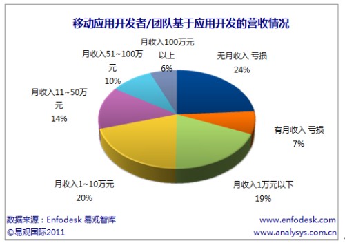 易觀國際(Analysys International)分析認(rèn)為應(yīng)用開發(fā)者難以獲取盈利分成的主要原因在于用戶對(duì)應(yīng)用本身沒有付費(fèi)下載習(xí)慣,應(yīng)用商店缺少對(duì)應(yīng)用的推廣,但應(yīng)用開發(fā)者難以盈利也和移動(dòng)應(yīng)用同質(zhì)化嚴(yán)重,難以被用戶認(rèn)可本身強(qiáng)相關(guān)。
