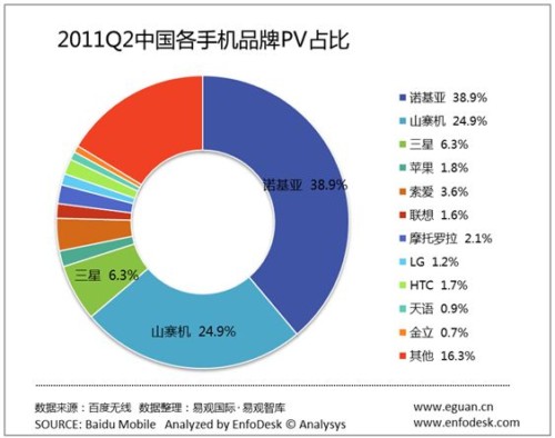CTI論壇(ctiforum)8月15日消息(記者 潘婷婷): 根據(jù)《移動互聯(lián)網(wǎng)發(fā)展趨勢報告》顯示,在2011年第2季度手機品牌PV占比中,諾基亞市場份額環(huán)比下降3%,跌至39%。其次是山寨機,占據(jù)了25%的市場份額。三星位列第三。