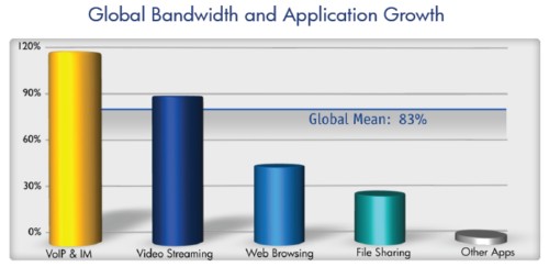 雖然網(wǎng)絡(luò)電話與即時(shí)通訊在下半年的網(wǎng)絡(luò)帶寬中占比仍然很低,它們的申請(qǐng)量證明了其在高速發(fā)展,相比上半年提升了114%。在下半年,Skype占了全球手機(jī)網(wǎng)絡(luò)電話使用量的79%。然而由于新競(jìng)爭(zhēng)者所帶來的壓力,它的份額根據(jù)上半年的82%有所下降,這些新出來的同行包括Viber,它的迅速成長(zhǎng)使其已經(jīng)占到了全球網(wǎng)絡(luò)電話流量的2%,超過了GoogleTalk 及Windows Live(這兩者都占1%)。