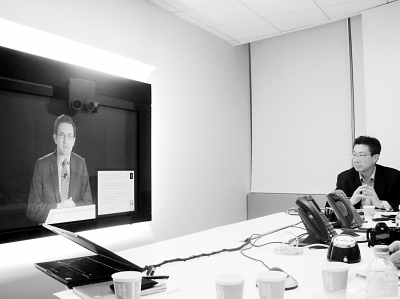 圖:Orange網(wǎng)絡(luò)解決方案業(yè)務(wù)部副總裁Nicolas Roy在巴黎演講,Orange中國區(qū)首席技術(shù)官劉昕(右)在主持北京視頻會(huì)議現(xiàn)場(chǎng)