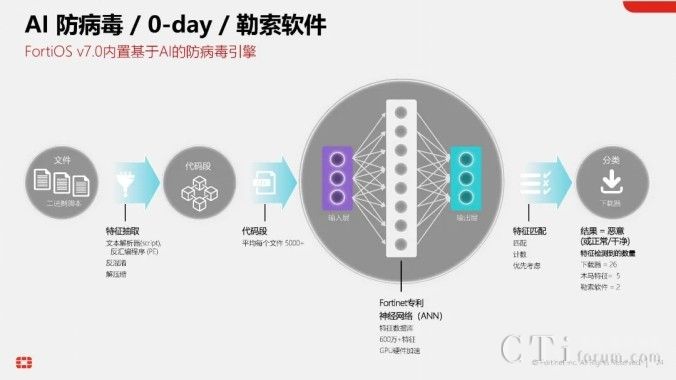 目前,AI技術(shù)已深度融入Fortinet的數(shù)十種產(chǎn)品與方案中。在最新版的統(tǒng)一網(wǎng)絡(luò)安全操作系統(tǒng)FortiOS 7.6中,就已經(jīng)內(nèi)置了由FortiGuard AI實(shí)驗(yàn)室研發(fā)的基于AI的防病毒引擎。該引擎運(yùn)用神經(jīng)網(wǎng)絡(luò)技術(shù),學(xué)習(xí)并區(qū)分海量病毒文件與正常文件,通過(guò)分類打分的方式,實(shí)現(xiàn)對(duì)未知文件與病毒的精準(zhǔn)判斷,無(wú)需依賴傳統(tǒng)的病毒特征庫(kù)。因此,F(xiàn)ortinet的FortiGate等產(chǎn)品在防病毒方面擁有雙引擎加持,既有傳統(tǒng)的基于病毒特征庫(kù)的防病毒引擎,又有基于AI的下一代防病毒引擎(Anti-virus NGAV),雙重保障,安全無(wú)憂。