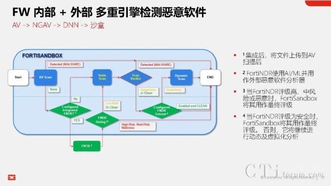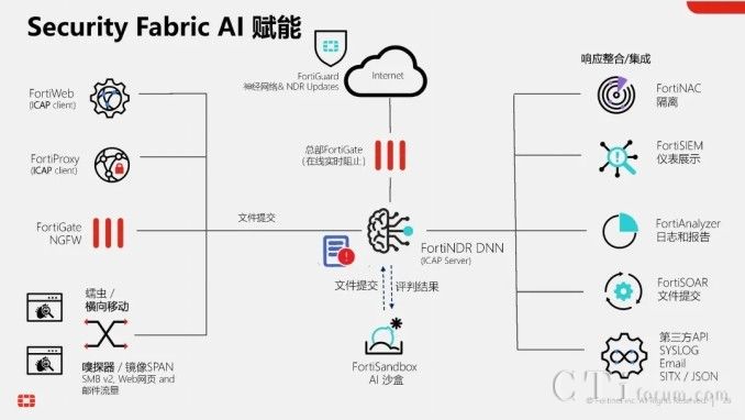 此外,AI技術(shù)還貫穿于Fortinet的多個(gè)產(chǎn)品與功能中,形成高效的工作流。以威脅檢測(cè)與響應(yīng)為例,當(dāng)FortiGate的雙引擎也無(wú)法確定某個(gè)文件的合法性時(shí),它可以將該文件提交給FortiNDR進(jìn)行深度分析,利用云端深度神經(jīng)網(wǎng)絡(luò)AI進(jìn)行0 Day攻擊、勒索軟件等深層次分析。若仍無(wú)法確定,還可進(jìn)一步提交給FortiSandbox,在虛擬機(jī)環(huán)境中進(jìn)行模擬操作,進(jìn)行更為深入的檢測(cè)。在這一系列流程與技術(shù)的支持下,F(xiàn)ortinet的威脅檢測(cè)與響應(yīng)能力已達(dá)到業(yè)界頂尖水平,向滿分100分邁進(jìn)。