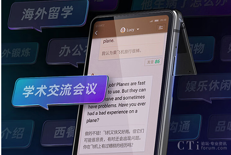 AI教練可以隨時隨地和用戶一對一地聊天,并會將聊天內(nèi)容用中英文對照的方式顯示在屏幕上,同時還會對用戶的口語發(fā)音進(jìn)行智能打分。