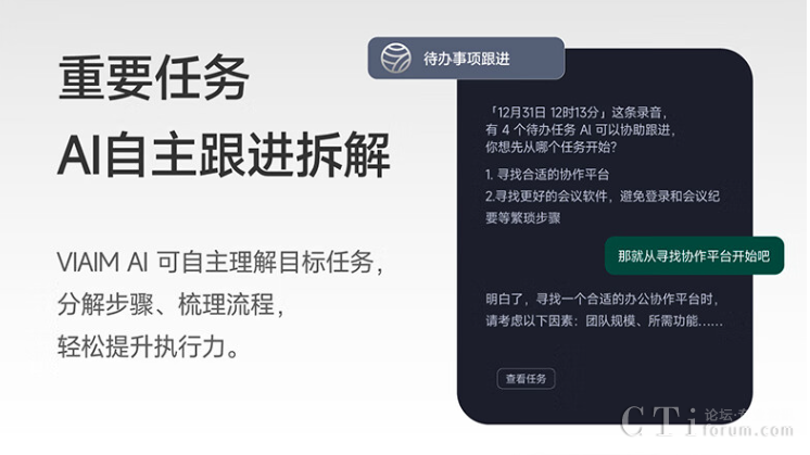 借助VIAIM AI智慧大腦,可一鍵提取會議摘要,海量會議內(nèi)容瞬間搞定,無需費(fèi)時手動梳理;待辦事項自動匯總,并可根據(jù)需求生成具體待辦子任務(wù),在執(zhí)行的過程中,科大訊飛降噪會議耳機(jī)Nano+會自主理解并分解目標(biāo)任務(wù)、理清流程,輕松提升執(zhí)行力。