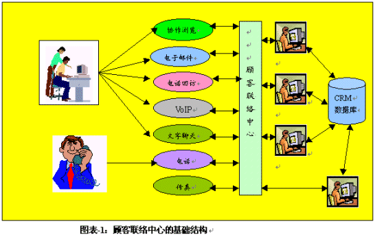 。。呼叫中心通過多年以來的發(fā)展,其傳統(tǒng)型的呼叫中心還是主要在以電話為媒介服務于顧客。這類呼叫中心的基礎結構包括ACD、IVR、CTI等技術應用平臺和界面,同時與企業(yè)的后臺資源相連接,例如大型或相關數(shù)據(jù)庫。但是,當今的呼叫中心已經(jīng)發(fā)展成為一個多媒體的服務或交易渠道,有的還能處理基于互聯(lián)網(wǎng)的垂詢和呼叫,而有的則是一個虛擬的顧客聯(lián)絡中心,例如圖表-1中描述的那樣: