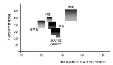 亞太地區(qū)正在成為CRM應(yīng)用軟件的新興市場。1999年亞太地區(qū)CRM市場的年增長率達33.5%。其中中國CRM市場是除日本外最具發(fā)展?jié)摿Φ氖袌觥nA(yù)計到2004年,中國CRM市場的復(fù)合年平均增長率為60%。