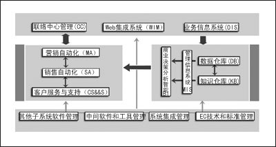 在信息技術(shù)管理子系統(tǒng)中,CRM的各功能模塊和相關(guān)系統(tǒng)運行都必須由先進(jìn)的技術(shù)、設(shè)備、軟件來保障,主要的內(nèi)容可以分為以下四類:其他子系統(tǒng)應(yīng)用軟件管理,如數(shù)據(jù)庫管理系統(tǒng)、電子軟件分發(fā)系統(tǒng)等;中間軟件和系統(tǒng)工具的管理,如中間軟件系統(tǒng)、系統(tǒng)執(zhí)行管理工具等;企業(yè)級系統(tǒng)的集成管理,如CRM與企業(yè)管理信息系統(tǒng)的集成,乃至整個的企業(yè)應(yīng)用集成方案,以實現(xiàn)將企業(yè)的CRM與ERP、SCM等系統(tǒng)緊密集成;電子商務(wù)技術(shù)和標(biāo)準(zhǔn)的管理,如Internet技術(shù)、EDI技術(shù)及標(biāo)準(zhǔn)、通信標(biāo)準(zhǔn)的管理等。為支持無線應(yīng)用,CRM技術(shù)管理子系統(tǒng)將提供與手機、PDA、智能家電等工具的通訊接口,采用J2EE或.NET技術(shù)平臺,以及在支持無線傳輸和無線LAN應(yīng)用等方面進(jìn)行相應(yīng)的調(diào)整。