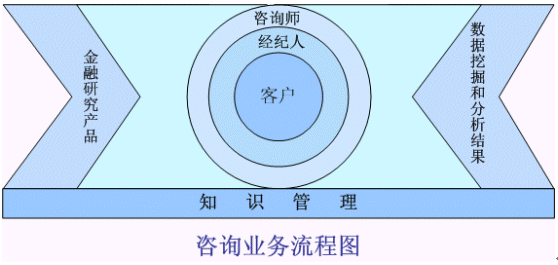 如上圖所示的證券經(jīng)紀行業(yè)的投資咨詢服務(wù)業(yè)務(wù)流程,是在整體的知識管理的平臺之上,根據(jù)金融產(chǎn)品的信息通道和數(shù)據(jù)分析和挖掘的基礎(chǔ),由咨詢師和經(jīng)紀人組成可行性的個性化服務(wù)小組為核心客戶提供真正的"一對一"投資設(shè)計和投資咨詢服務(wù)。